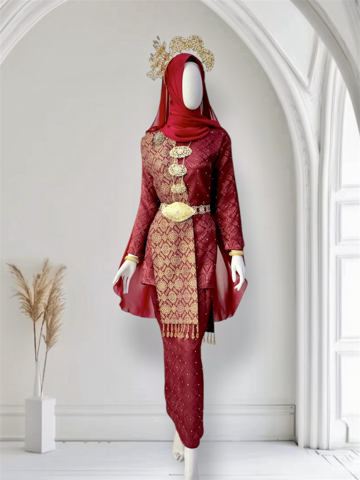 Baju Kurung Tradisional Songket Tenun - Maroon Gold- Saiz L